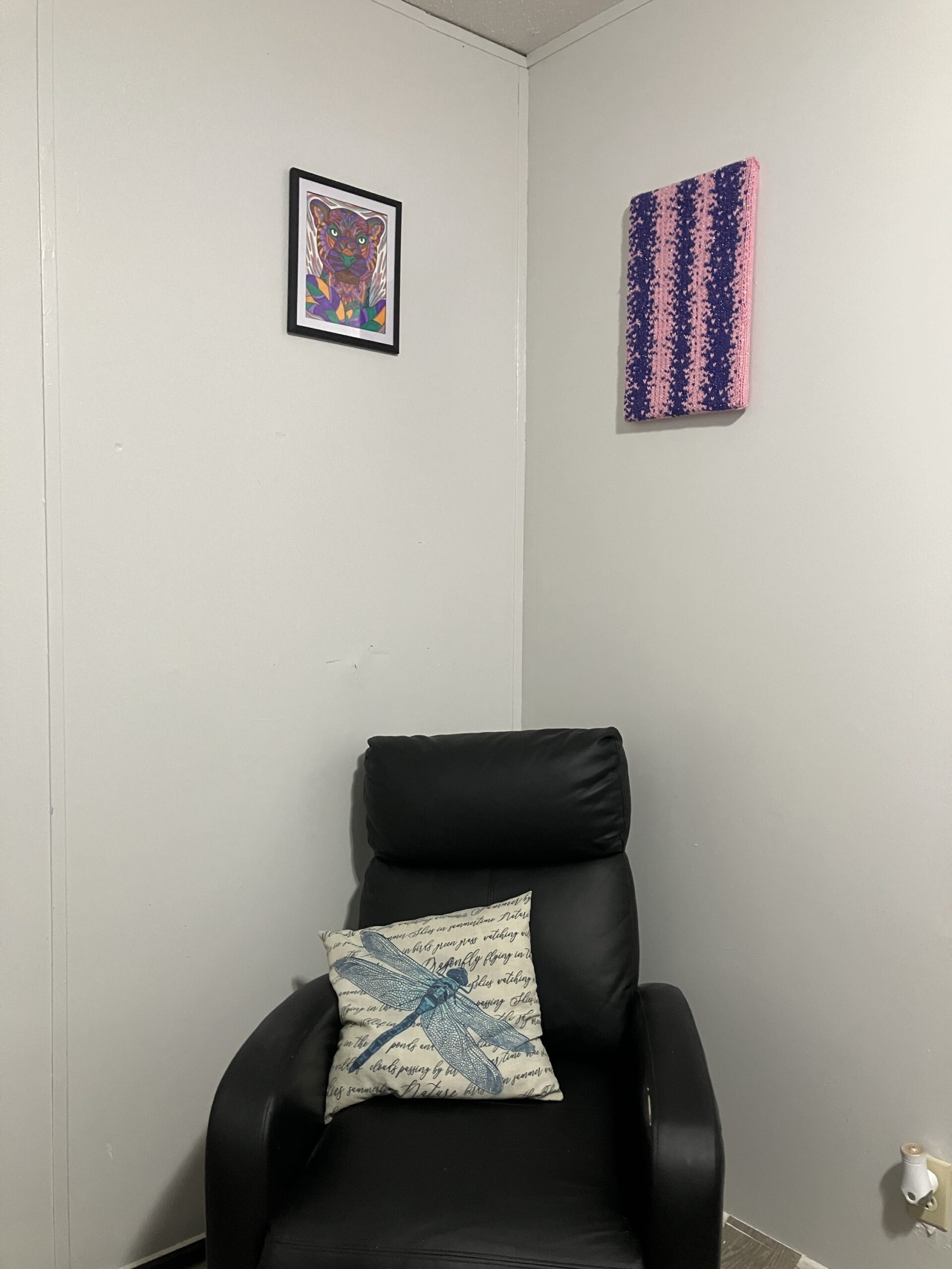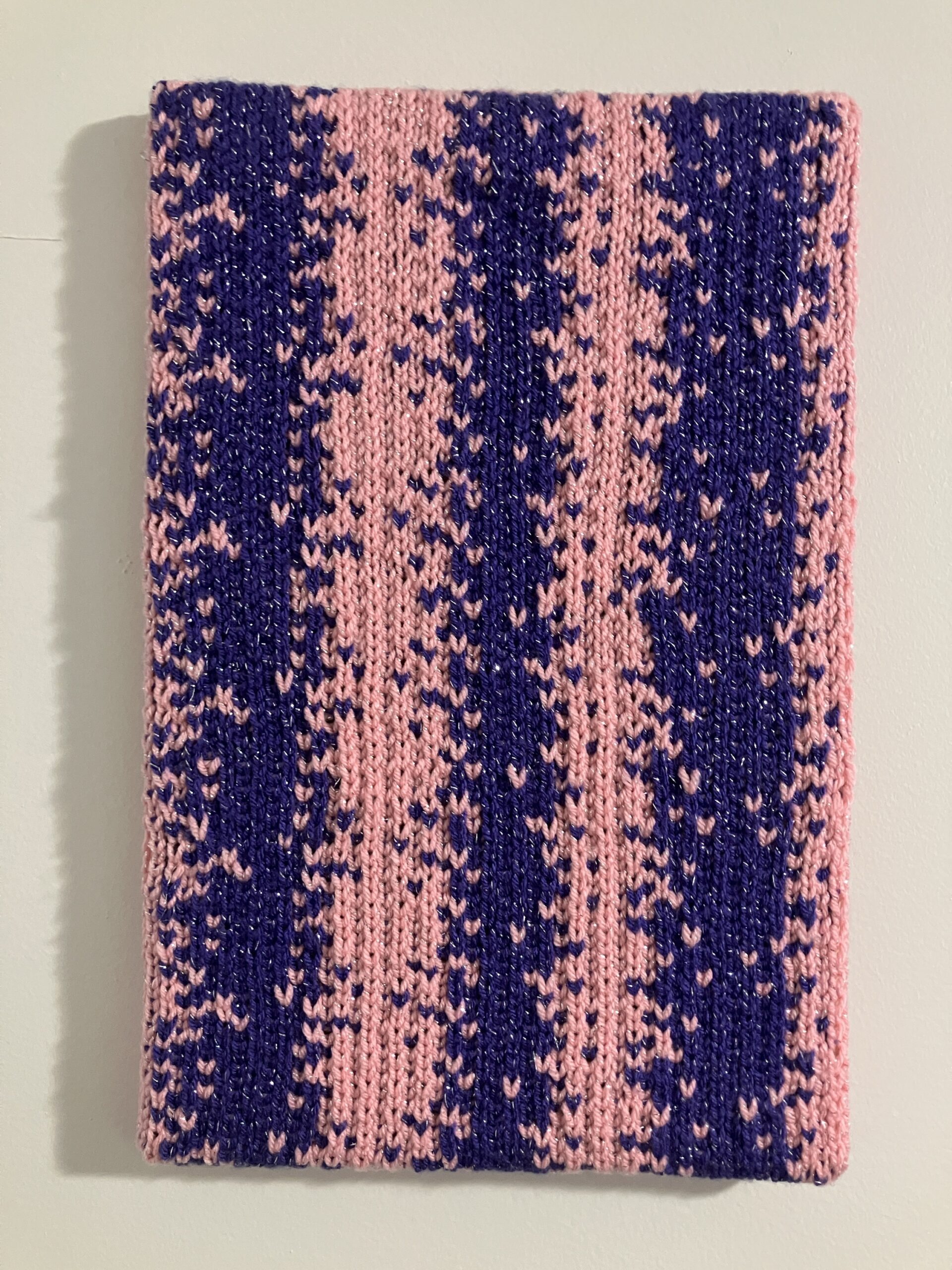 This work features vertical striping in solid pink and purple. The composition is defined by clear color separation and a steady, repeating structure.