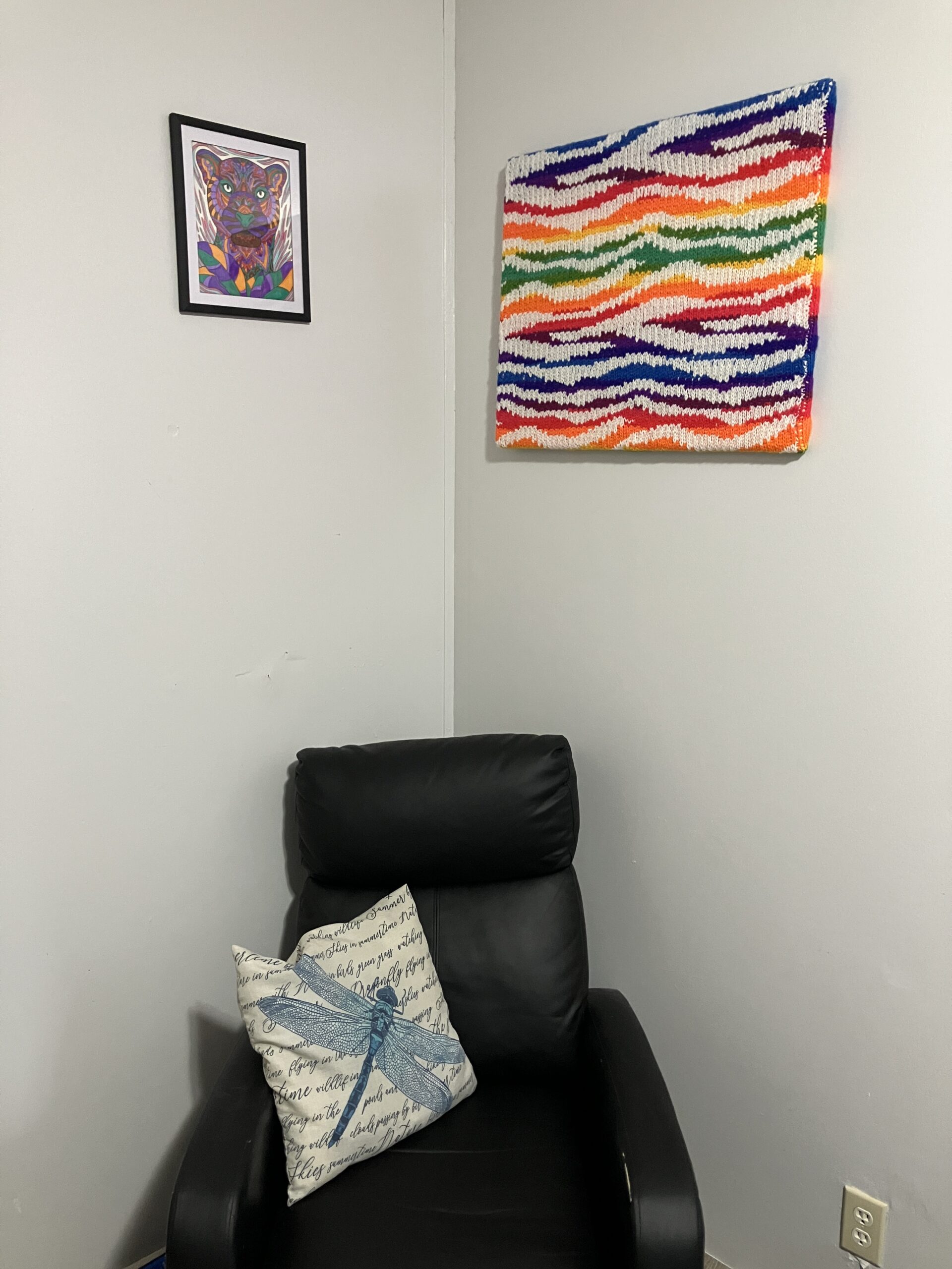 This work features a rainbow-colored background overlaid with white zebra-patterned stripes. The repeated pattern creates a strong graphic presence across the surface.