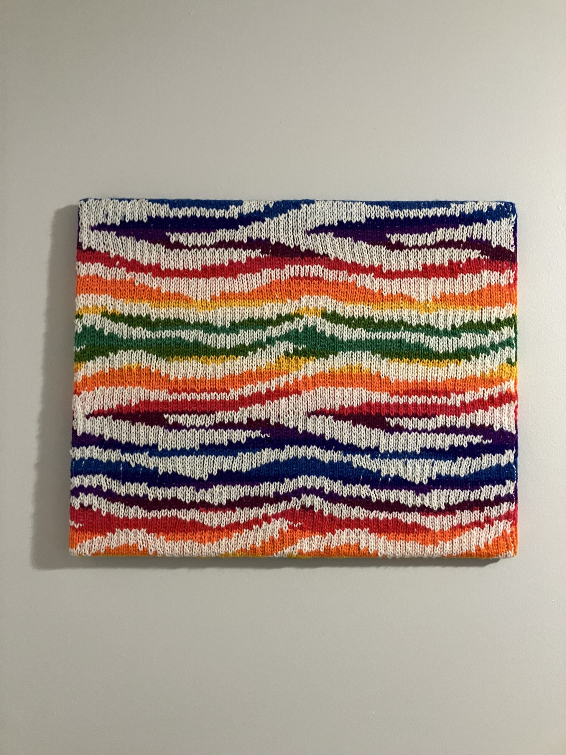 The solid white striping contrasts sharply with the saturated color field beneath it, emphasizing shifts in hue and movement throughout the piece. The interaction between pattern and color heightens visibility without overwhelming the composition.