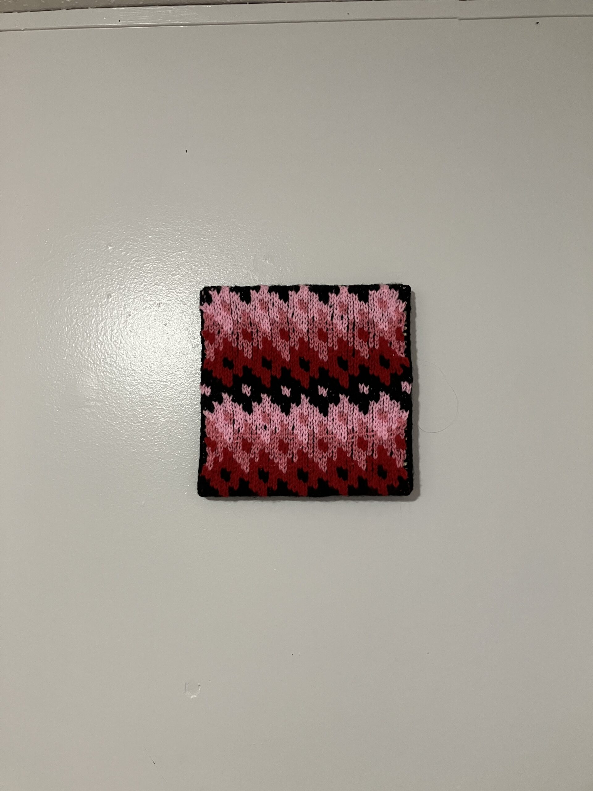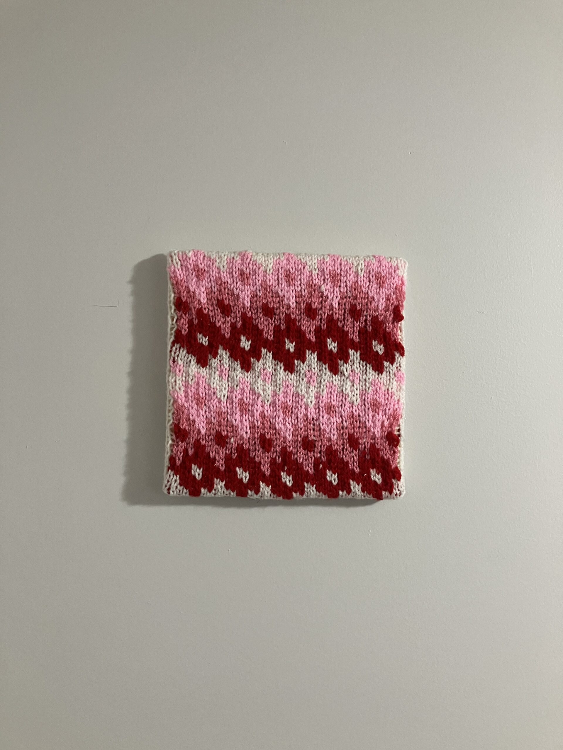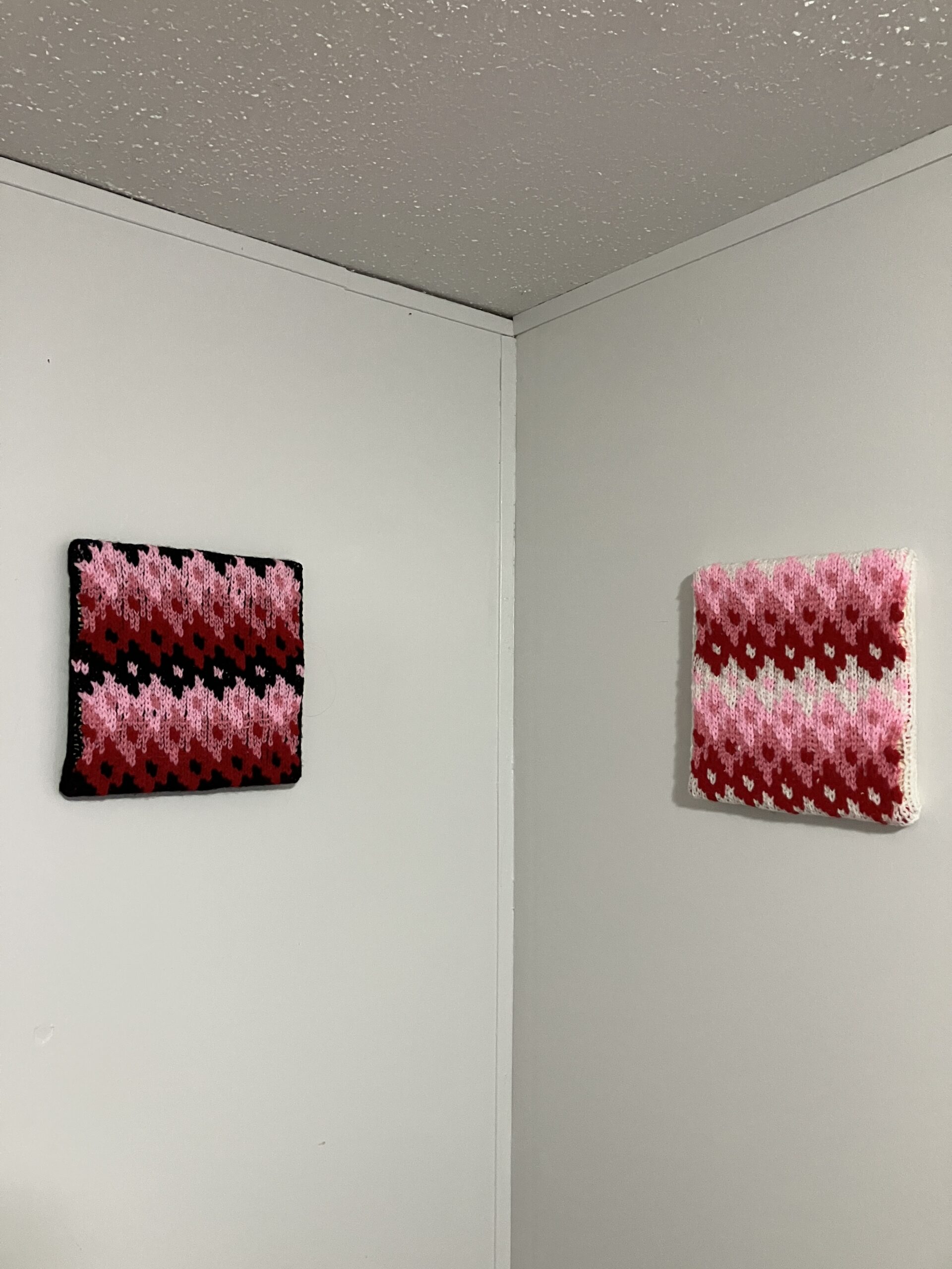 This work is composed of a block-based striped pattern and features layered shades of red and pink, paired respectively with black in one work and white in the other.