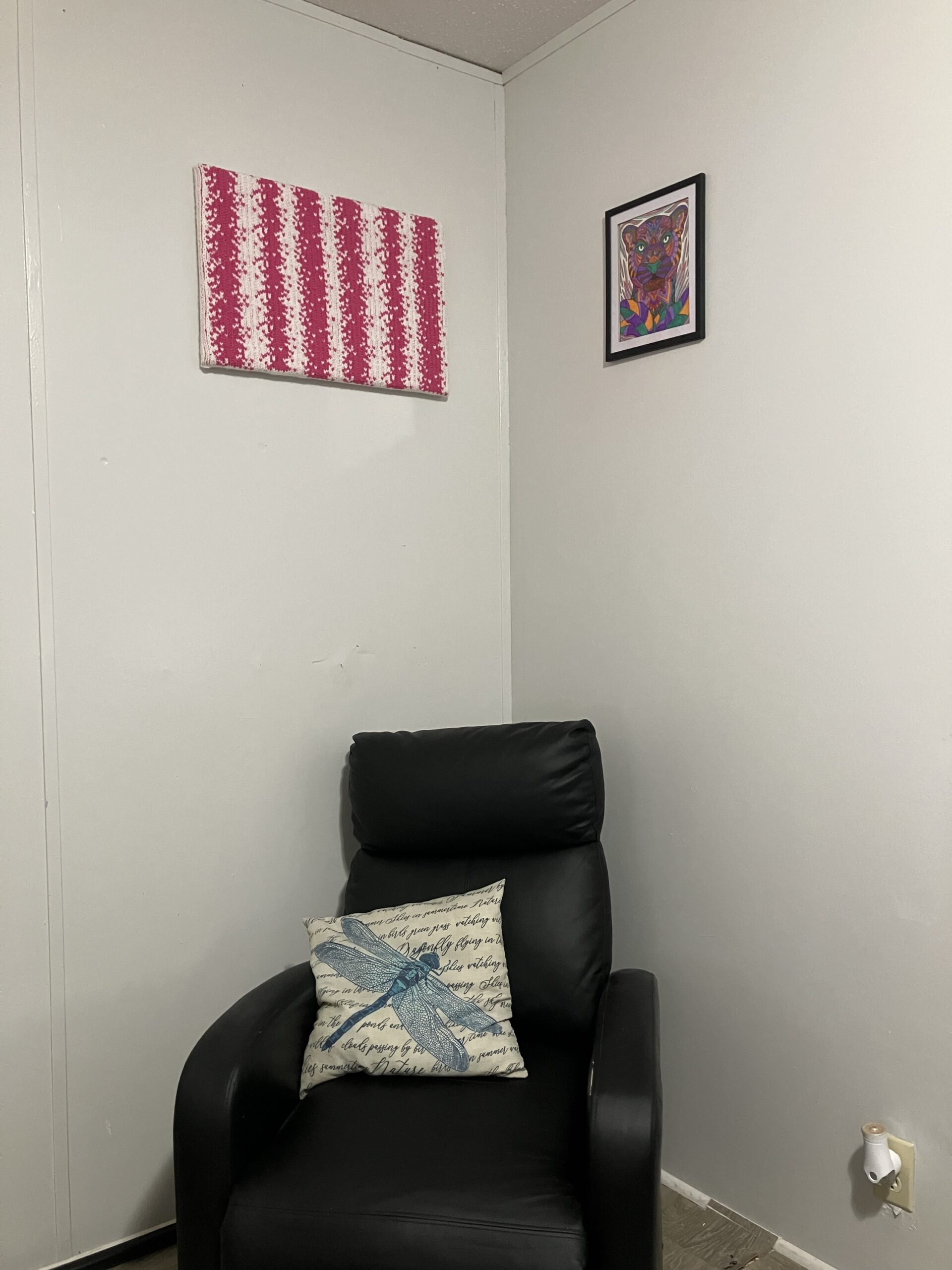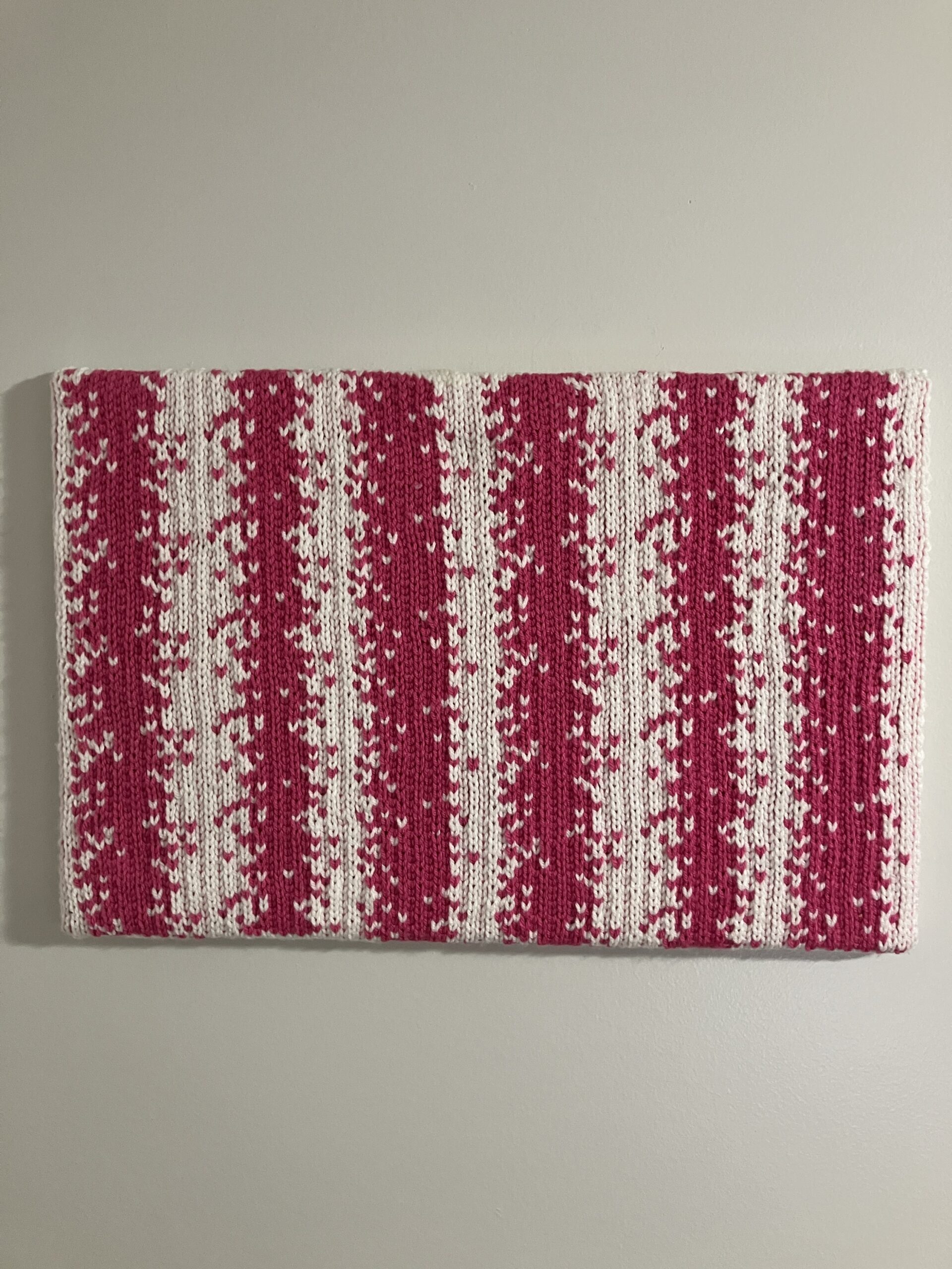 This work features vertical striping in solid pink and white. The composition is defined by a clear, repeating structure and a restrained color palette.